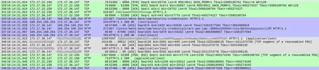 但在两次交换之间,蓝色部分占用了 86 毫秒。这到底是怎么回事?在数据包 333,我们的服务向 /latest/meta-data/iam/security-credentials 发送了一项 HTTP GET 请求,而后在同一 TCP 连接上,又向 /latest/meta-data/iam/security-credentials/arn:.. 发送了另一项 GET 请求。