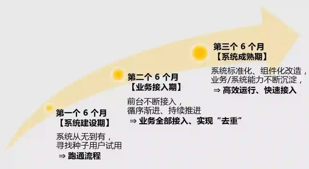 在这个过程用6个月,如果有坚定的信念和较强的目标感,基本能完成单条产品线全面接入的目标。6个月的业务接入期,加上6个月的系统早期建设,1年节点又是一个关键的里程碑。并且全部业务接入,也是一个比较好量化的体现中台去重、复用的系统指标。