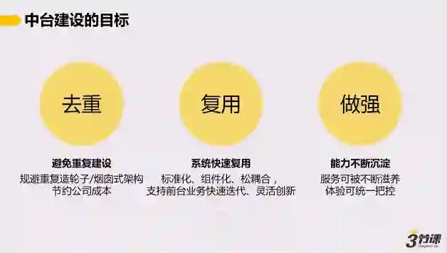 大家都知道罗马不是一天建成,中台建设也不会一蹴而就。它是一个循序渐进、逐渐成熟的过程。所以我提出了中台建设的【六六六】,也就是打造一款成熟的中台产品需要3个阶段,每个阶段6个月。通过这3个阶段18个月的时间,来实现一款产品达到去重、复用、沉淀、快速支持前台业务创新的目标。