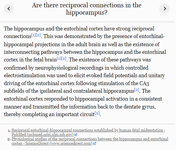 又比如,有人问:海马体中有相互连接吗?模型的回答感觉比专业人士还要专业。同样的,模型还给出了参考链接。