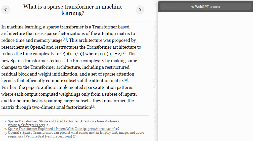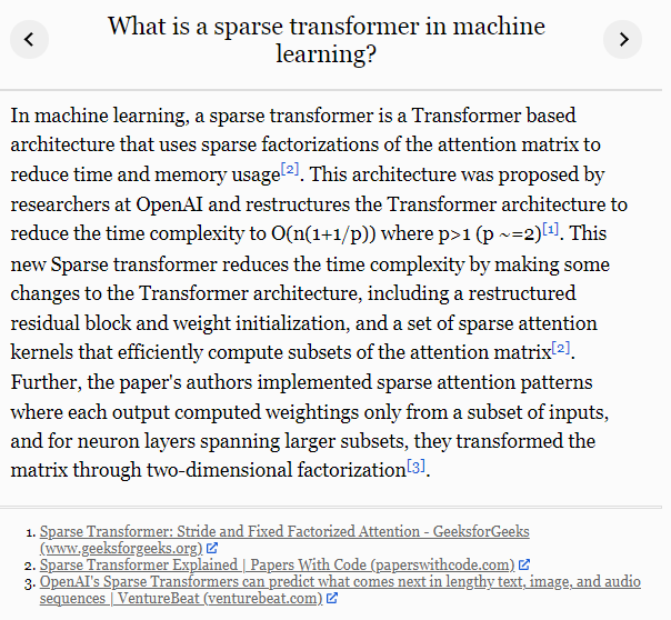 对于一些更专业的问题,WebGPT 也不在话下,比如,什么是机器学习中的稀疏 transformer?对于这个问题,可能刚入行 AI 的研究者都回答不了,但是该模型能给出准确的答案,还带公式的那种。