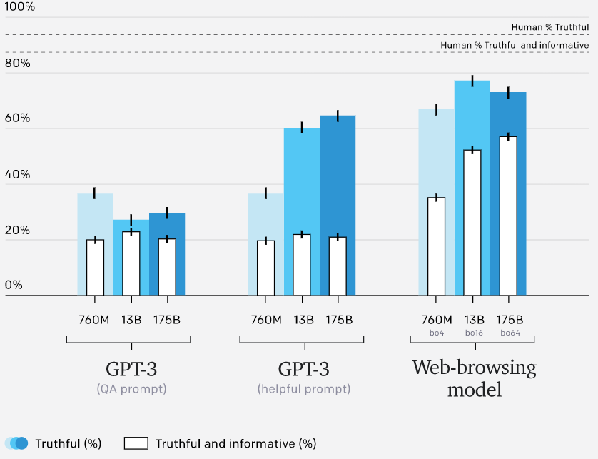 对于从训练分布(training distribution)中提出的问题,OpenAI 最好的模型的答案平均与我们的人类演示者写的答案一样准确。然而,对于 out-of-distribution 问题,鲁棒性是一个挑战。为了探讨这个问题,OpenAI 在 TruthfulQA 数据集上进行了评估。OpenAI 的模型在 TruthfulQA 上优于 GPT-3,并表现出更有利的扩展特性。然而,OpenAI 的模型落后于人类的表现,部分原因是它们引用了不可靠的来源。该研究希望使用对抗训练等技术来减少这些问题。