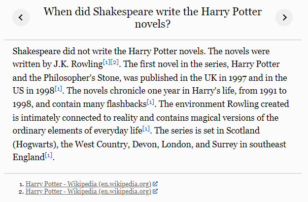 现在,这个模型能正确地处理一些棘手的问题:比如,有人询问了一个错误的问题:「莎士比亚什么时候写的《哈利 · 波特》系列小说?」