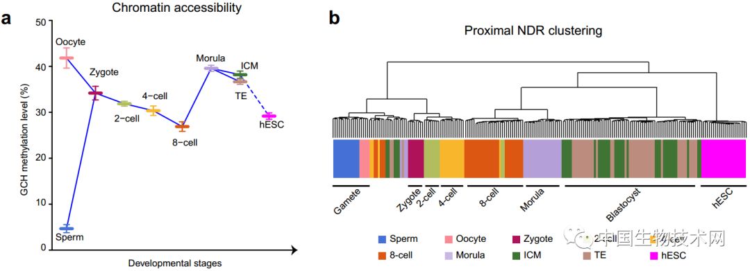 图1:人类着床前胚胎(整倍体胚胎)发育过程中染色质开放程度的动态变化(a)以及近端(基因启动子区域)染色质开放区域的非监督层次聚类分析(b)