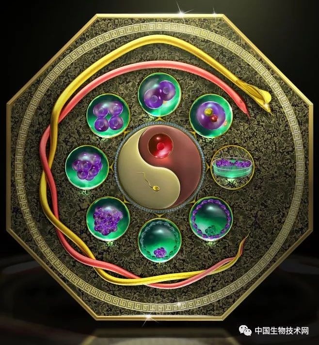 图片设计源于“八卦”,在此代表人类来自精子的父源基因组与来自卵细胞的母源基因组在受精后的“阴阳融合”。整幅画面传递着人类受精卵在发育过程中,父源基因组(金色蛇)染色质快速打开并且其开放程度迅速超过母源基因组(红色蛇),并将这一逆转的开放程度不对称状态一直维持到4-细胞胚胎阶段这一含义。