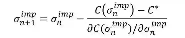这个方程并没有显式解,这样需要使用列如Newton等数值方法来估计正确的解。最常用的是Newton方法,使用相关函数的一阶导数,直到达到了规定的迭代次数或者是某种精确性。对于某个初始值 σ^imp 和 0<n<∞: