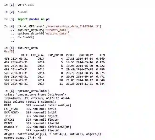 其他参数都来自于期权数据以及需要进行计算获得。数据存储在pandas DataFrame对象中并保存在PyTables数据库文件中。我们需要将它读入内存。