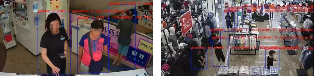 图片数据集将提供以下标签:零售场景中行人的位置、属性(身份(导购、顾客)、性别)、行为类别(姿态(站立、坐)、行为(玩手机、未玩手机)等)。
