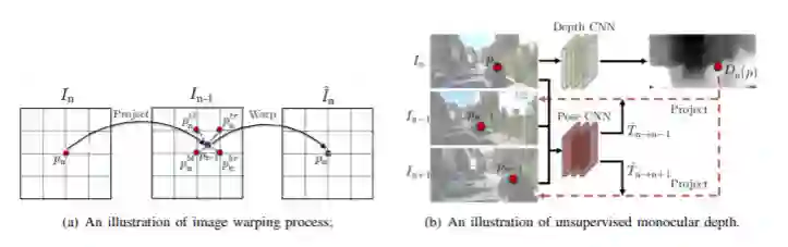 无监督方法的基本模型:无监督方法由单眼图像序列训练,几何约束建立在相邻帧之间的投影上