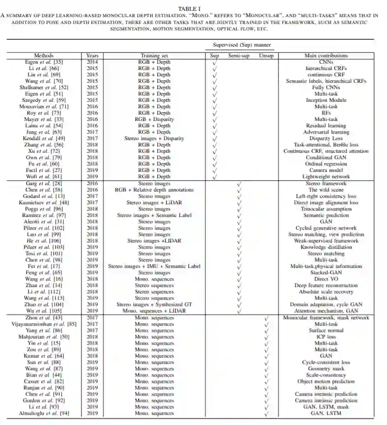在本节中,我们将从使用地面真实性的角度来回顾单目深度估计方法:有监督方法、无监督方法和半监督方法。虽然无监督和半监督方法的训练过程依赖于单目视频或立体图像对,但训练后的深度网络在测试过程中从单个图像预测深度图。我们从训练数据、监督信号和贡献等方面对现有的方法进行了总结,并收集了在KITTI数据集上评价的无监督和半监督算法的定量结果。