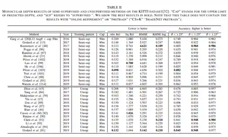 精度:以往的工作主要集中在通过采用新的损失函数或网络框架来提高深度估计的精度,如表一所示。LSTM、VAE、GANs等几种著名的网络框架在提高深度估计性能方面已显示出其有效性。因此,随着深层神经网络的发展,尝试新的网络框架,如三维卷积、图形卷积、注意机制[和知识蒸馏,可能会得到令人满意的结果。虽然无监督方法在训练过程中不依赖于地面真实情况,但其精度与目前最有效的半监督方法相差甚远,如表二所示。寻找一个更有效的几何约束来改进无监督方法可能是一个很好的方向。