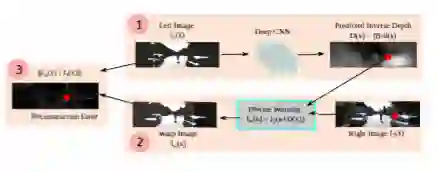 基于立体图像对的半监督单目深度估计的一般框架。深度网络取左图像预测其像素级逆深度图(或视差图),利用预测的逆深度图通过逆扭曲算法从右图像重建左图像。通过计算重构误差来监督训练过程。