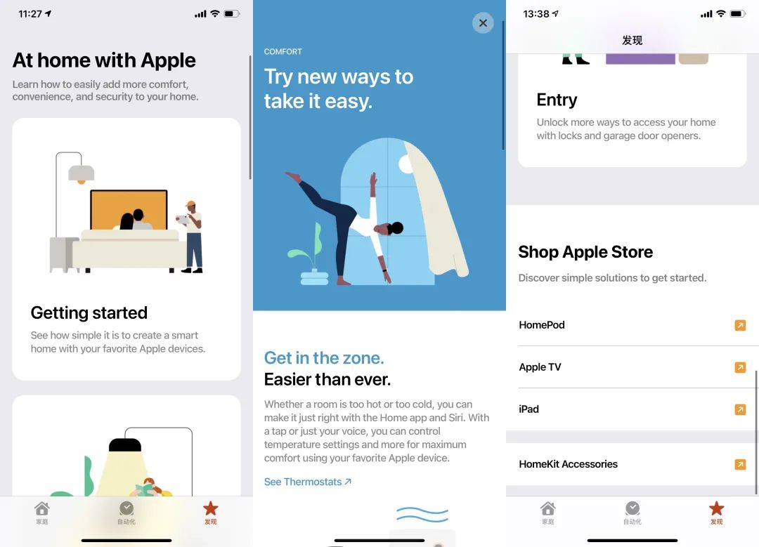 苹果为「家庭」App 加入了「发现」栏目,分为各种情境围绕 HomeKit 进行的推广,为用户推荐可连接 HomeKit 的智能家居产品。点击商品会直接自动跳转至 Apple Store App 的商品页面内。