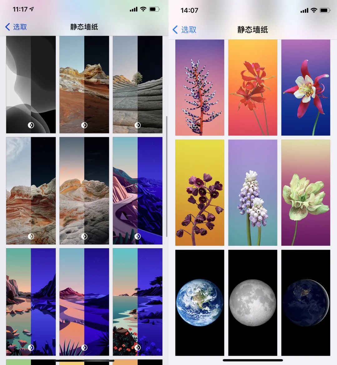遗憾的是,新壁纸的到来也意味着老壁纸的离开。大家非常熟悉的「地球」主题以及「花蕊」主题共 9 张壁纸已经从系统默认壁纸中去除。