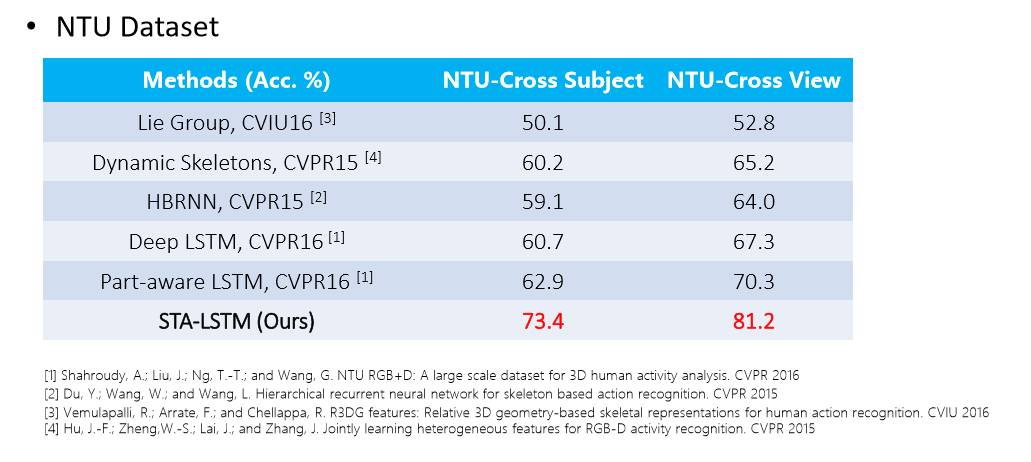 从NTU这个目前最大的3D skeleton数据集的结果可以看出来,在短短一两年的时间,提升还是很大的。我们的STA-LSTM方法做出的结果有很好的效果。