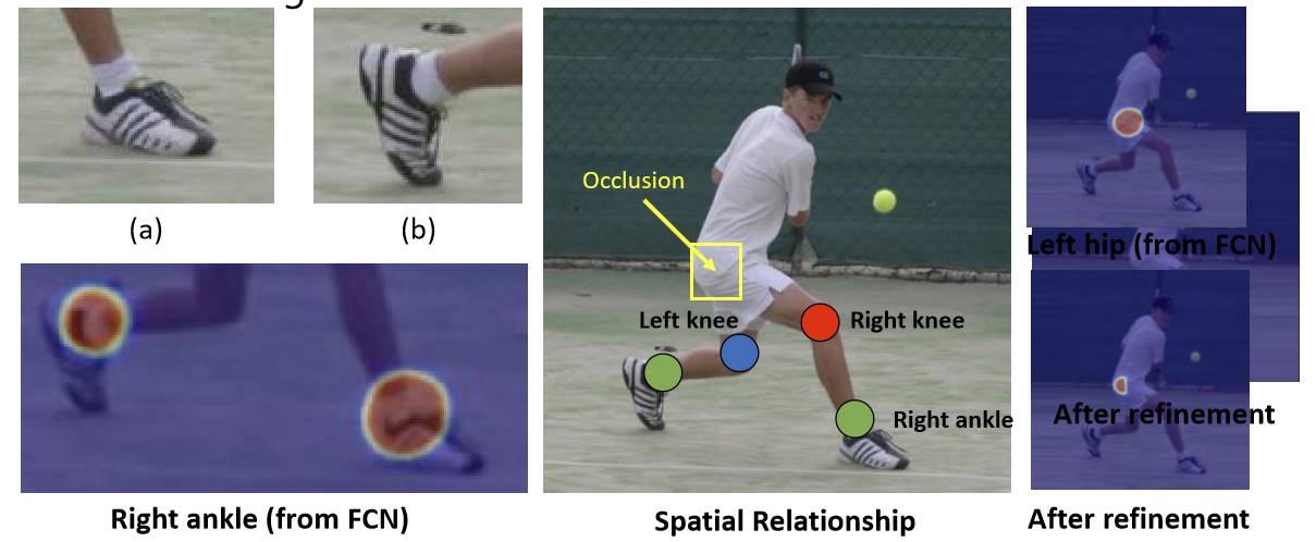 关于关节点估计(Pose Estimation)的挑战实际上也很多。第一个问题是相似性,左踝关节和右踝关节可能很难区分。在这种情况下,可能需要利用不同关节间的特殊关系来帮助确认。第二个问题是动作、姿势的多样性。如果利用关节间的特殊关系,就需要想办法去考虑到各种各样的情形,因为图像中不一定在头部左边的就是左肩。我们找到了一个方法可以把比较多样的状况标准化成比较一致的数据,只要数据一致之后就具有一定的统计性,有了统计性就会很好学。