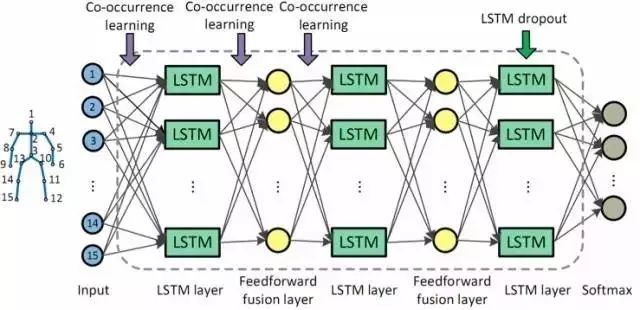 图中的LSTM是属于特殊类别的一种RNN,因为它有记忆性,所以在每一个时刻,它不但能看到当前这一帧的骨骼,还记下了前几帧的骨骼信息。因此,它可以做一个总体的判断,来表示在一小段时间里面,动作是如何变化的,这样行为识别可以做的更好。LSTM是目前非常流行的方法,它对于时序数据或者视频数据来说都是一个很好的工具。