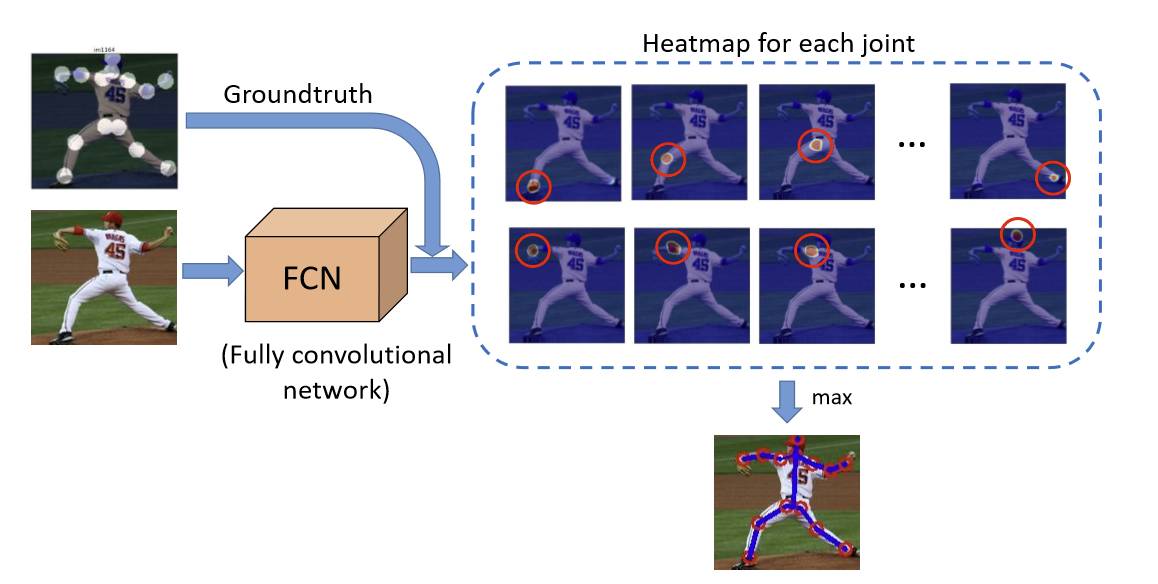 这个问题其实也很有挑战性。一是动作可以有各种各样的表现,然后还有遮挡的问题,有些关节会被其他的身体部分给挡住。这方面的工作基本是用一个完全卷积网络(fully convolutional network)去提取信息,给出一个热度图,也就是一个概率。这个模型基本上可以给每一个不同的关节一个概率的分布图,这样就能大概知道,哪里可能是头、膝盖等。
