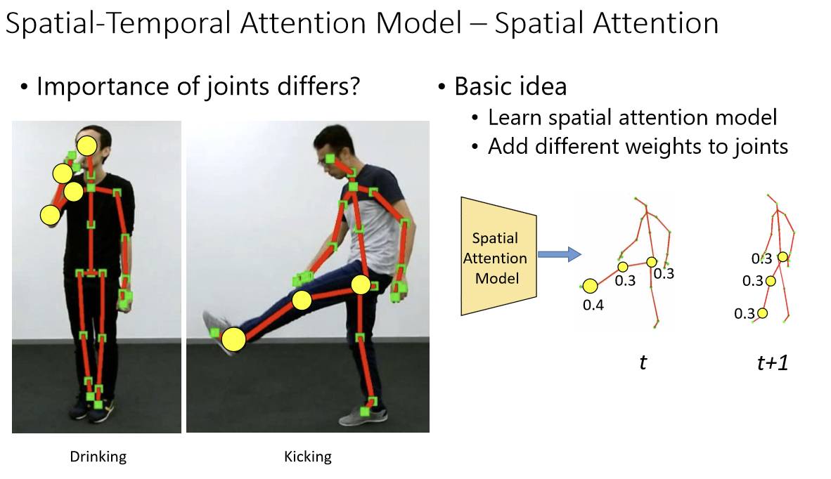 此外,在做行为识别时,可以看到一个特定的动作其实不是所有的关节都是同样重要的。比如下图,喝水的时候,手部、肘部的关节可能比较重要,腿部可能就是噪声。