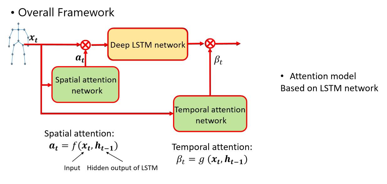所以我们有一个空域注意力(spatial attention),就是做一个特定动作的分类器,从而更多关注那些需要学习的关节,这样就可以把噪声去掉,在做设计的时候才能做的更好。同样,在输出上也是一样,因为这是一个序列,所以实际上在每一帧里面可能都有一个输出。