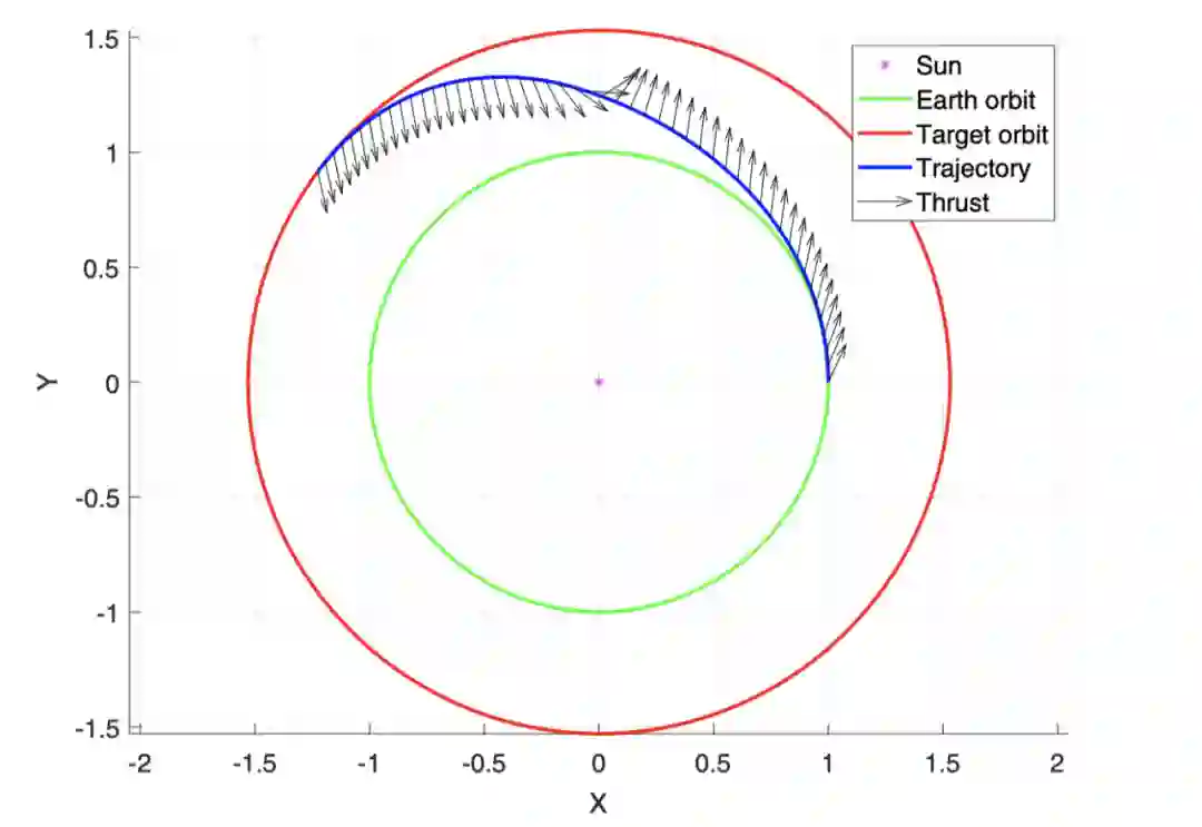 反过来说动力如果充足的话, 大概跟科幻片一样对准目标,然后“咻”一下就飞过去了,不用绕这些弯了。当飞行器从一颗行星轨道(比如地球)转移到另一颗行星轨道(比如火星)时,发射时机和轨道就需要特殊选择和设计优化。但不管事情有多复杂,总得遵循天体力学的运作原理,这些原理又被列成了方程,那么这些方程也就可以被作为物理知识嵌入到神经网络中了。比如这篇文章: