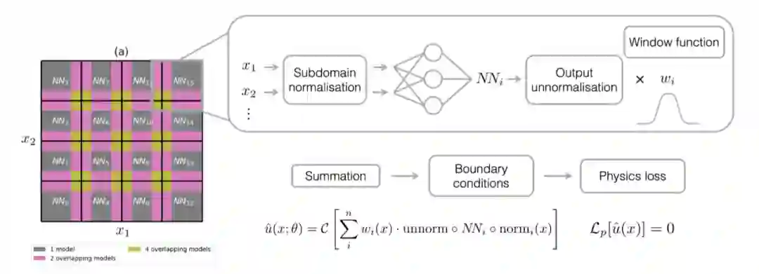 区域分解(Domain Decomposition)。在 PDE 的数值求解中,可能会遇到区域较复杂的问题。单个神经网络能表达的容量也是有极限的,要在更复杂的区域上对解进行表达,要么增大网络,也就是在一个网络上增加深度和宽度,但对 PINN 通常使用的 MLP 进行这样的操作可能会带来梯度爆炸或者梯度消失之类的问题,使得求解变得更为困难。因此,借用传统 PDE 求解中区域分解技术,让不同的网络对不同的区域进行学习,从而降低单个神经网络需要的复杂度和学习难度。