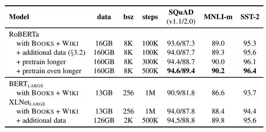 更大的模型参数量(从 RoBERTa 论文提供的训练时间来看,模型使用 1024 块 V 100 GPU 训练了 1 天的时间)