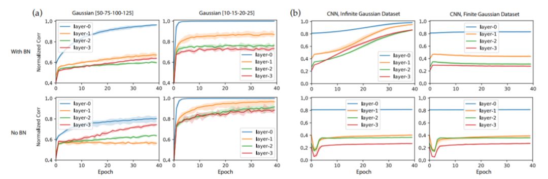 关于有限与无限数据集:我们还在卷积神经网络的案例中使用预生成的GAUS有限数据集重复实验,并发现节点相似性的收敛在几次迭代后终止。这是因为一些节点在其激活区域中接收的数据点非常少,这对于无限数据集来说不是问题。我们怀疑这可能是CIFAR-10作为有限数据集没有表现出GAUS类似行为的原因。