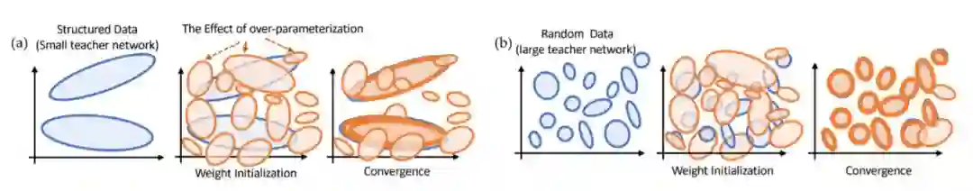 对于结构化的数据,其对应生成数据的教师网络较小,过参化得到的学生网络中的结点会优先朝着教师网络的结点收敛过去,并且初始时和教师网络结点重合较大的学生结点(也即是“幸运神经元”,lucky weights/nodes)会收敛得更快,这样就会产生“胜者全拿”的效应,最后每个教师结点可能只有几个幸运学生结点对应。对于随机数据,其对应的教师网络比较大,学生结点会各自分散向不同的教师结点收敛。这就是为什么同样大小的模型可以同时拟合两者。并且因为胜者全拿的效应,学生倾向于用最少的结点去解释教师,从而对结构数据仍然具有泛化能力。