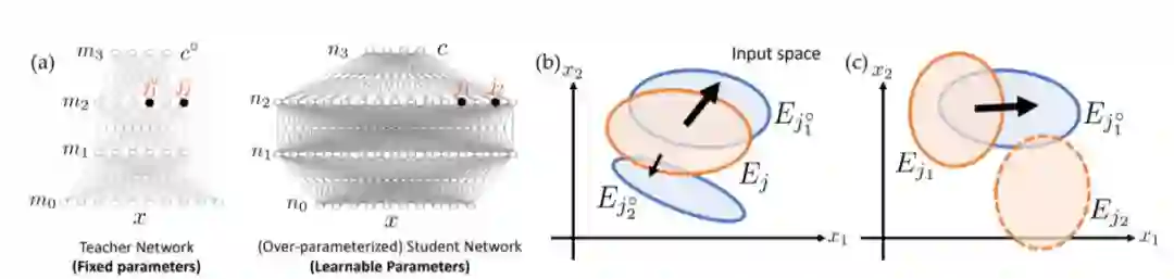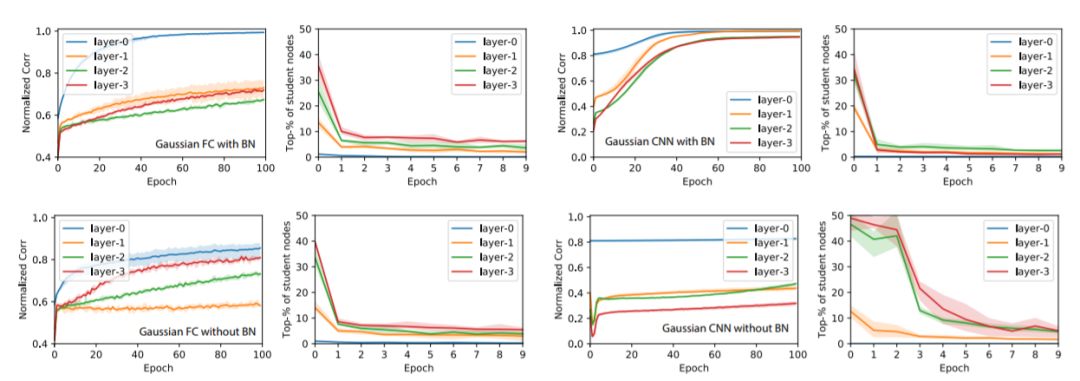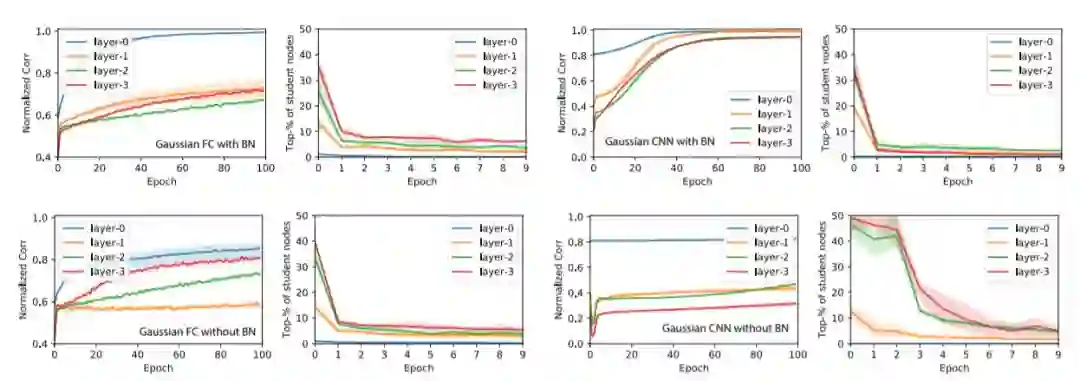 在过度参数化中,许多学生节点在每一层进行随机初始化。任何教师节点都更可能与某些学生节点有很大部分的重叠,这会导致快速收敛(图2(a)和(c),)。这也解释了为什么网络容量恰好适合数据的训练模型的性能表现会更差。