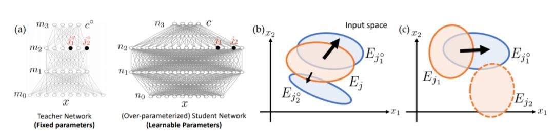 基于这个框架,我们试图用统一的观点来解释这些令人费解的经验现象。本文使用师生设置,其中给过度参数化的深度学生ReLU网络的标签,是具有相同深度和未知权重的固定教师ReLU网络的输出(图1(a))。在这个角度来看,隐藏的学生节点将随机初始化为不同的激活区域。(图2(a))。