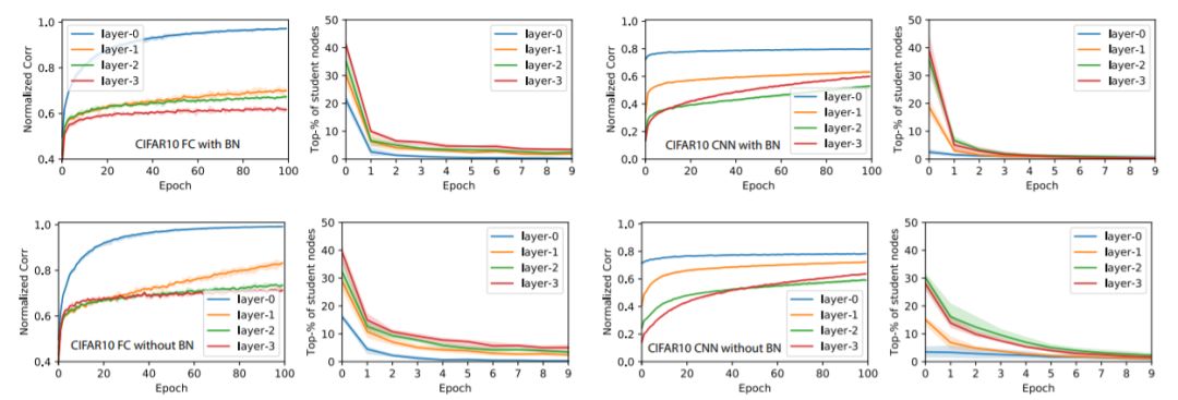 关于教师网络的大小:对于小型教师网络(10-15-20-25,全连接网络),收敛速度要快得多,不使用BatchNorm的训练比使用BatchNorm训练要快。 对于大型教师网络,BatchNorm肯定会提高收敛速度和ρ¯的增长。