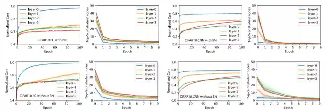 我们计算出在验证集上评估的教师和学生激活之间的归一化相关度(或余弦相似度)ρ。在每一层中,我们对教师节点上的最佳相关度进行平均得到ρ¯,ρ¯≈1表示大多数教师节点至少由一名学生覆盖。