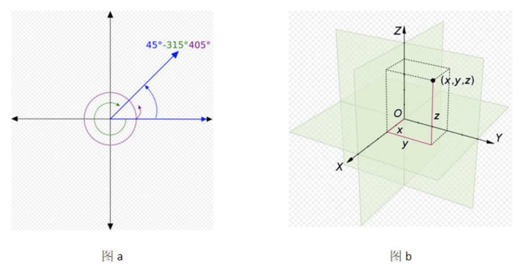 图 a 表示二维欧几里得空间,图 b 表示三维欧几里得空间。