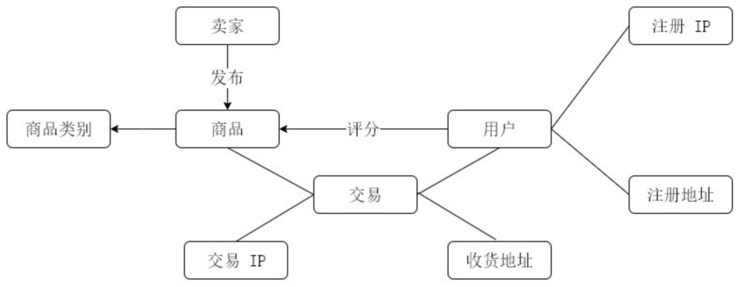 对于一个简单的电商的图,其包含卖家,商品和用户三个关键节点,其中,商品节点关联商品类别节点,用户节点关联注册 IP 节点和 注册地址节点。当用户在购买商品时,用户节点和商品节点就会关联交易节点,同时,交易节点也会关联用户下单时所对应的 IP 节点以及收获地址节点,对应的图结构如下图所示。