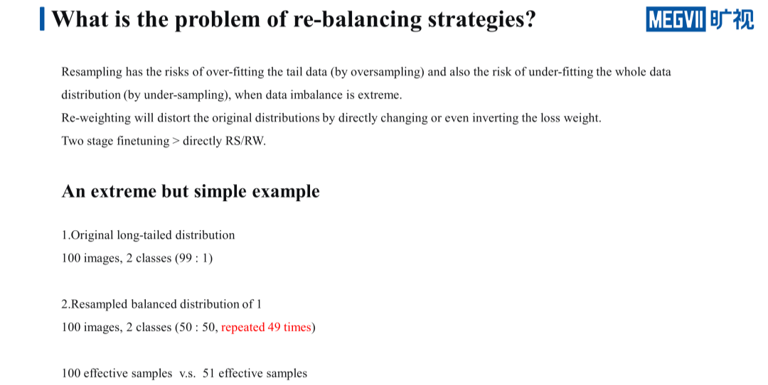 我们再回过头来看一下 re-weighting 和 re-sampling 这些策略,虽然它们可以较好地提升长尾识别的性能,但是也存在着一些缺点和不足。这些缺点和不足会不会导致 re-balancing 策略对网络产生负面的影响呢?
