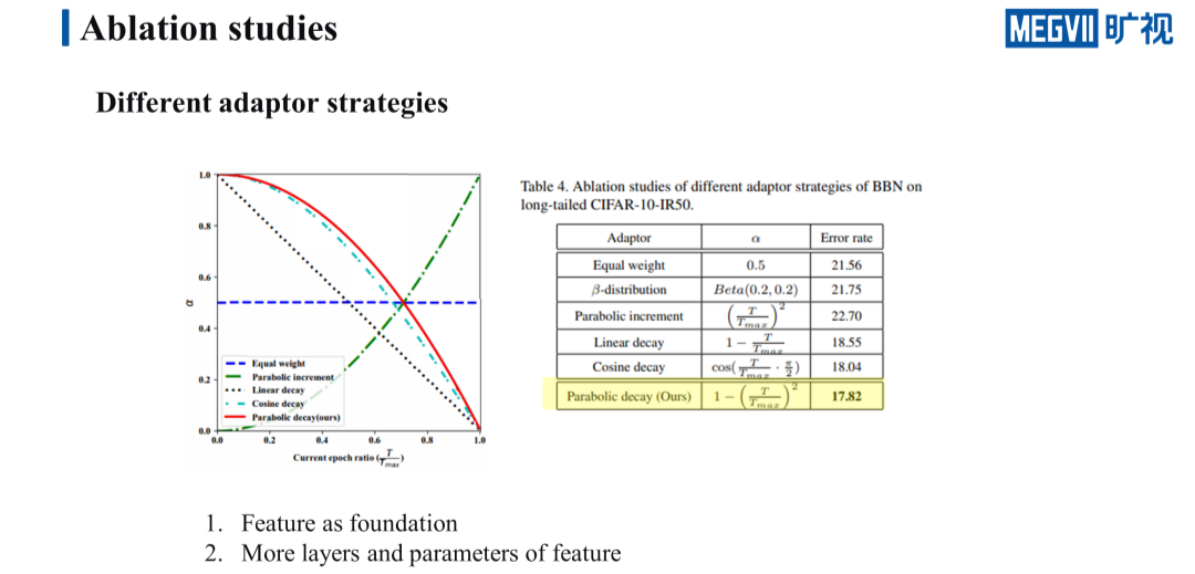表格里的前三行分别是固定值、β 分布及抛物线居中,这三种策略的效果都很差,这也证明了特征是分类器的基石这一原则。我们要让网络在前期更加关注特征学习,随后再慢慢地将注意力转移到 tail 类的分类性能上面。