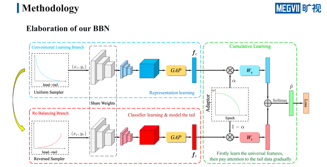此外,我们还提出了一种全新的累积学习(Cumulative Learning)策略,配合 BBN 网络首先进行通用特征的学习,随后逐渐将注意力转移到尾部类的识别上。