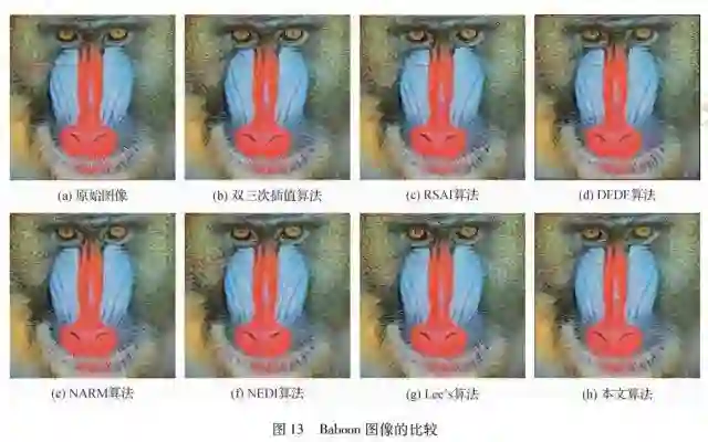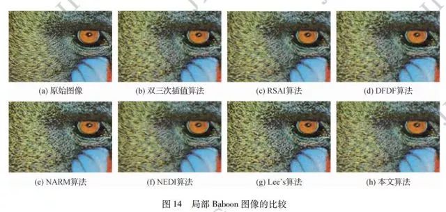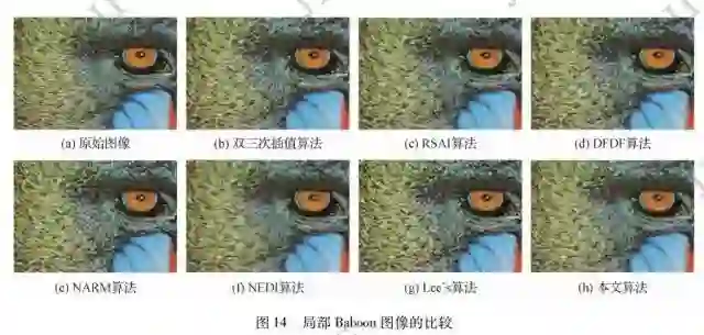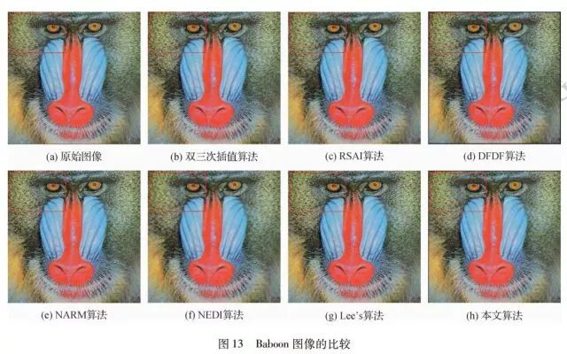 从客观数据、主观效果、时间复杂度3个方面对重建图像进行评价,客观数据包括峰值信噪比(PSNR)和结构相似性(SSIM),从实验结果可以看出,本文算法的PSNR平均提高了0.14~1.50 dB,SSIM平均提高了0.005~0.097。从主观效果来看,本文算法的重建图像的纹理细节更加丰富,边缘结构更加清晰,从时间复杂度来看,本文算法的平均运行时间是3.77 s,分别比DFDF、NEDI、RSAI、Lee's、NARM算法快了3.28倍、5.26倍、53.28倍、43.53倍、418.54倍。特别地对纹理细节丰富的图像,本文算法在峰值信噪比和结构相似性上较对比算法有突出优势,主观效果有明显提高。