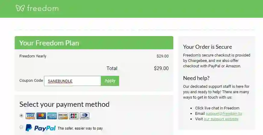 Freedom 的定价对于不少人来说较为高昂,SaneBox 为我们提供了一个 6 折的优惠码,无论是月付、年付还是买断,我们都可以在支付时使用 SANEBUNDLE 这个优惠码来获得优惠。