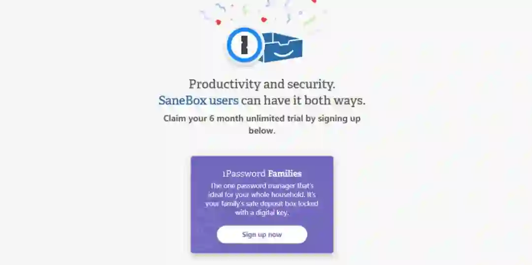 你可以注册一个新的 1Password 账户,并获得 SaneBox 赠送的 6 个月家庭版免费试用。
