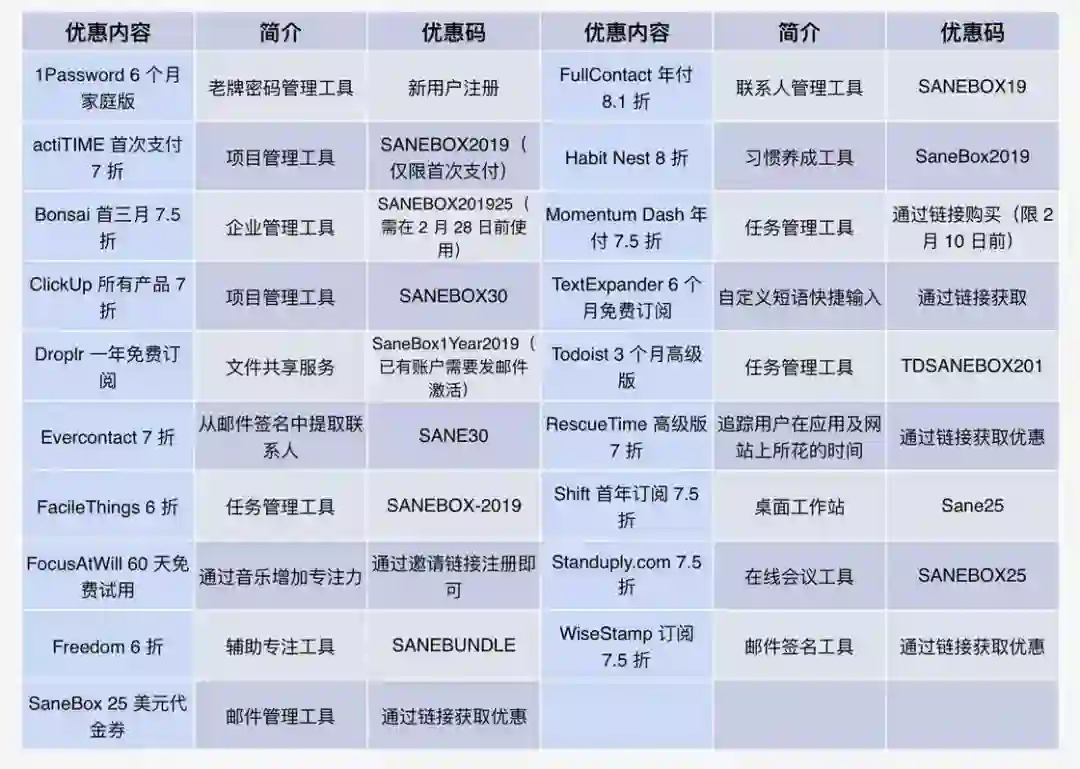 除了上述提到的六个服务外,SaneBox 还提供了辅助专注的音乐服务 FocusAtWill 的 60 天试用、SaneBox 自家邮件管理服务的 25 美金代金券等优惠,总价值超过 200 美元。所有优惠可以参考下表。