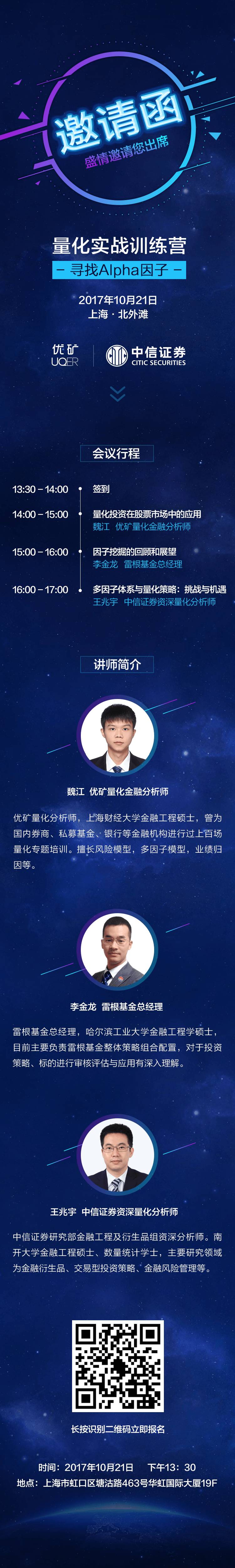 本次活动定位为“实战”,核心在于告诉大家如何去更好的实施量化投资。优矿量化金融分析师魏江、雷根基金总经理李金龙、中信证券资深量化分析师王兆宇将和大家一起探讨量化投资在股票市场中的应用,寻找Alpha因子。
