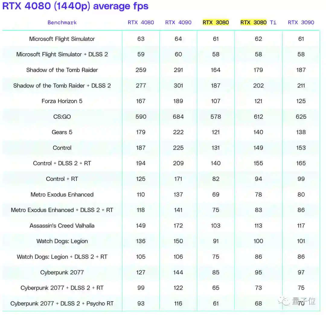平均而言,RTX 4080在1440p下的帧率(fps)比RTX 3080快50%左右,比RTX 3080 Ti快30%-40%。