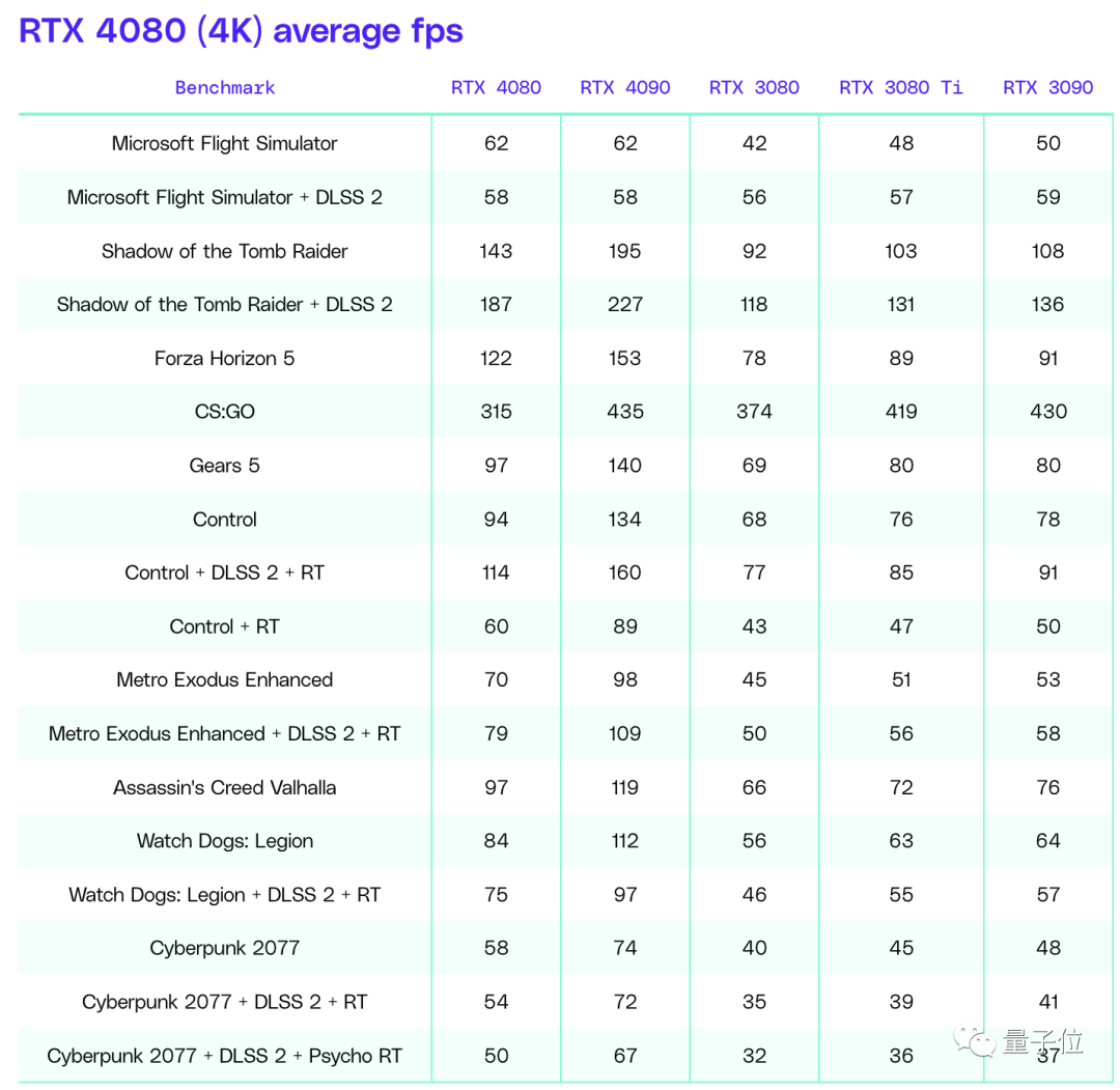 结果在游戏画面显示上,RTX 4080完胜所有RTX 30系列卡。