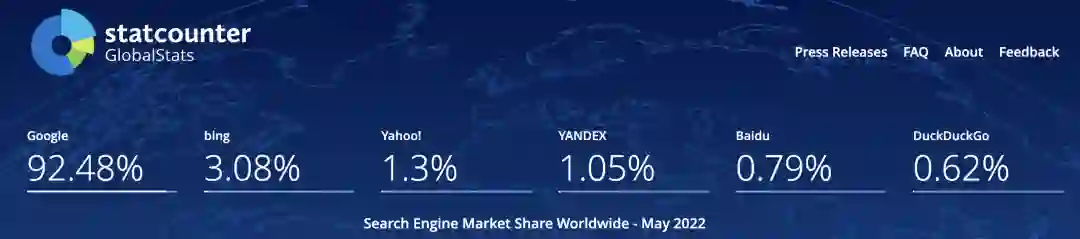 此外,在 Google 已经完全称霸的搜索引擎市场,即使是微软的 Bing 依靠全球最为流行的操作系统 Windows,却也没有占到一点优势,在占比 92.48% 的 Google 面前,其市场占有率仅有 3.08%,