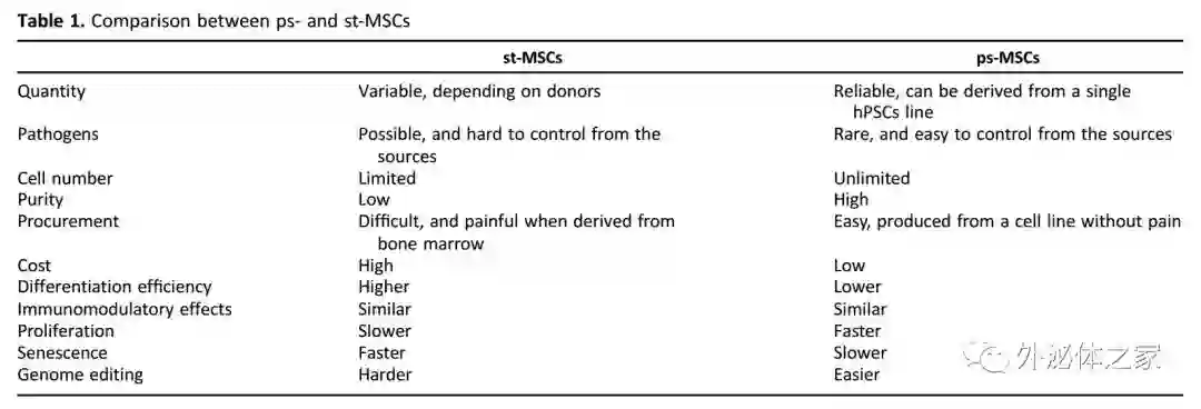 人类多能干细胞(hPSCs)包括人胚胎干细胞(hESCs)和诱导多能干细胞(iPSCs),具有分化成任何类型的体细胞(包括MSC)的能力。与st-MSCs一样,hPSC衍生的MSC(ps-MSCs)包括来自hESC(hES-MSC)和人类iPSC(hiPS-MSC)的MSC,在体外和体外均具有相似的特性,如多谱系分化能力和体内免疫调节作用。ps-MSCs相对于st-MSC的独特优势包括无限供应,更便于质量控制,遗传操作和可扩展生产,更低成本和更高纯度。