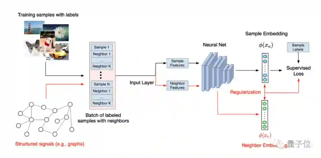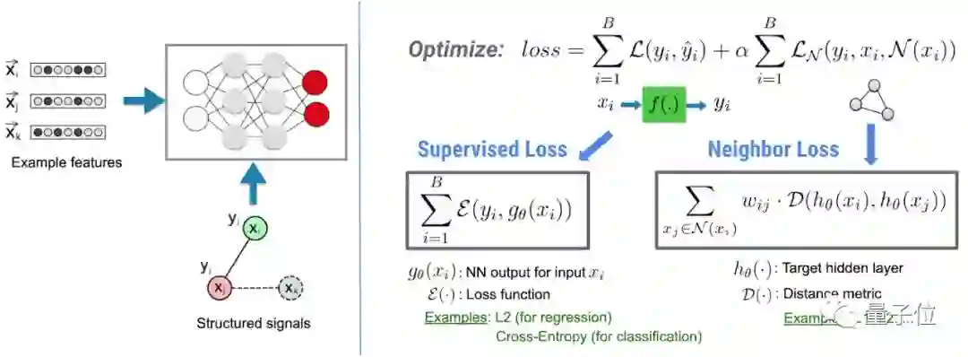 如何让结构化信号包含在神经网络之中呢?2018年,谷歌在提交的一篇关于“神经图学习”的论文中,构造了一种考虑数据结构关系的损失函数。