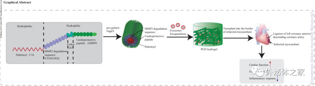 在本研究中,研究人员采用了一种新型可注射的自组装PA,用于递送干细胞。研究人员加入了心脏保护肽(GHRPS,His-DTrp-Ala-Trp-DPhe-Lys-NH2)和基质金属蛋白酶-2(MMP-2)可降解序列Gly-Thr-Ala-Gly-Leu-Ile-Gly-Gln(GTAGLIGQ)到PA中从而制备出PA-GHRPS。 MMP-2可降解序列能够使水凝胶降解,确保包封的外泌体和GHRPS肽释放到周围组织中。 GHRPS属于生长激素释放肽的成员,可以激活促存活途径并抑制炎症和纤维化。NapFF是一种自组装肽两亲化合物,由与苯丙氨酸二肽的N末端偶联的萘乙酰基尾组成,具有很强的自组装能力,可形成水凝胶。因此,研究人员旨在确定PA-GHRPS的凝胶形成能力,并确定这种功能性多肽水凝胶是否可以延长外泌体在体外的存活时间,从而改善心肌梗塞后的心脏功能。
