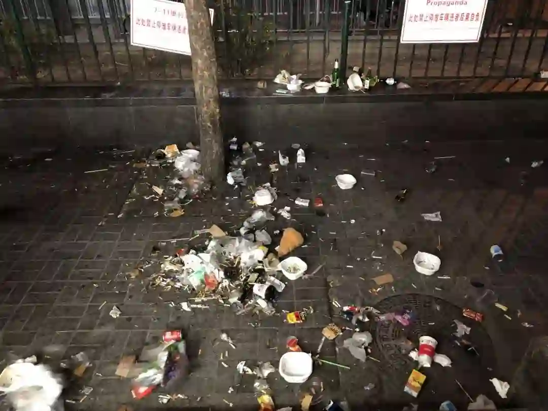 大爷一边「驱赶」着人群,一边挥舞着大扫把,清理着酒后的「战场」。